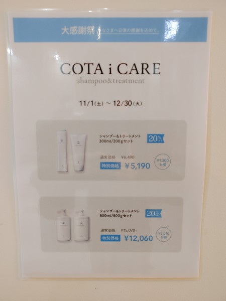 シャンプートリートメント剤はCOTA|コタのアイケア、クチュールを使用しております。